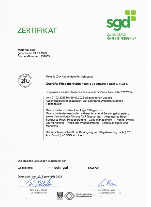 Die Qualifikation für Pflegeberatung nach § 7a SGB XI ist vorhanden. Diese Beratungen können jedoch nur im Auftrag der Pflegekassen stattfinden.